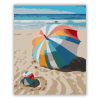 Színes Tengerparti Jelenet - számfestő készlet – 40×50 cm (Keret nélkül) A festmény egy színes strandlabdát és egy széles csíkos napernyőt ábrázol, melyek árnyékot vetnek a homokra a déli napsütésben. A kép meleg színekben pompázik, a homok arany, a tenge