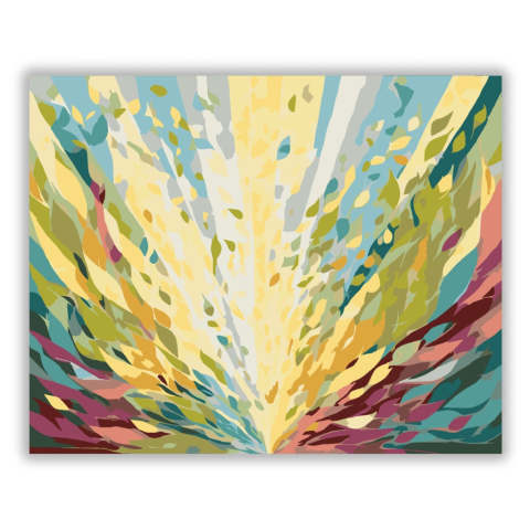 Színpompás Levélörvény - számfestő készlet – 40×50 cm (Keret nélkül) A festmény különböző méretű és színű leveleket ábrázol, amelyek örvényszerűen mozognak. A színek közé tartozik a citromsárga, málnapiros, smaragdzöld és égkék, melyek dinamikus és frissí