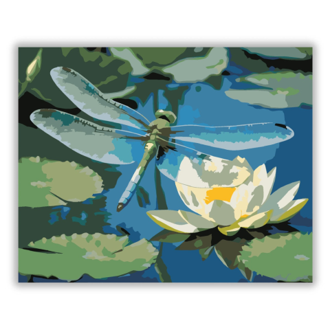 Szitakötő Lótuszvirágon - számfestő készlet – 40×50 cm (Keret nélkül) A festmény egy szitakötőt ábrázol, amint egy lótuszvirágon pihen a víz felszínén. A szitakötő áttetsző szárnyai kék és zöld árnyalatokban csillognak, harmonizálva a víz nyugtató kék szí