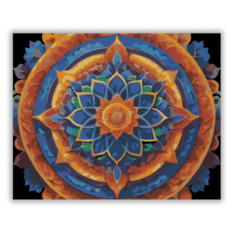 Szivárványos Csakra Mandala - számfestő készlet – 40×50 cm (Keret nélkül) A festmény egy szivárvány színeiben pompázó mandalát ábrázol, amely a test energia központjait szimbolizálja. A képen dominálnak a kék, narancs és lila árnyalatok, melyek harmonikus