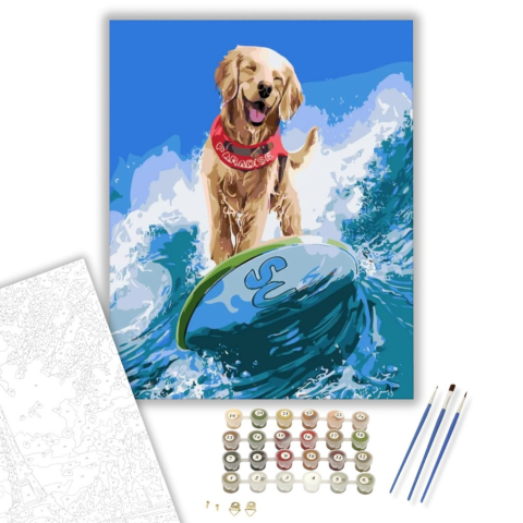 1 kép Számfestő.hu Szörföző kutya - számfestő készlet – 40×50 cm (Keretre feszítve)