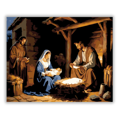 Születés a Jászolban - számfestő készlet – 40×50 cm (Keret nélkül) A festmény Máriát, Józsefet és a kis Jézust ábrázolja egy szerény istállóban. A meleg gyertyafény meghitt és békés hangulatot teremt, kiemelve a szent családot. A kép a születés csodáját é
