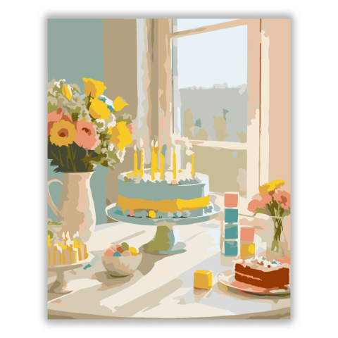 Születésnapi Asztal Virágokkal és Tortával - számfestő készlet – 40×50 cm (Keret nélkül) A kép egy ünnepi asztalt ábrázol, melyen torták, színes gyertyák, virágok és ajándékok találhatók, a napfény meleg sugaraival az ablakon keresztül. A pasztell színek