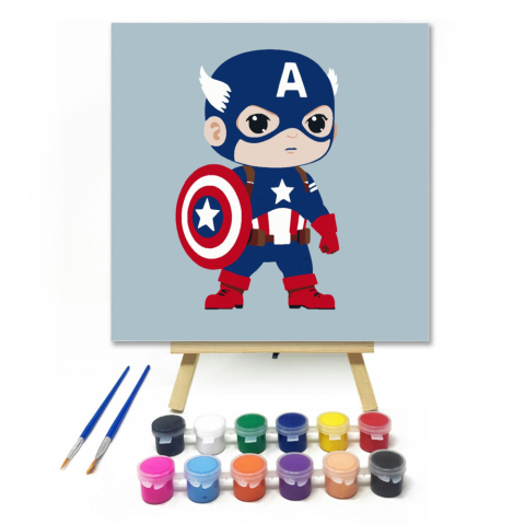 Szuperhős készenlétben - gyerek számfestő készlet – 20×20 cm (Keretre feszítve) Ez a kép egy bátor kis szuperhőst ábrázol, aki pajzsával készen áll a kalandra! A piros, kék és fehér színek igazi hősi hangulatot teremtenek. Tökéletes választás minden kis h