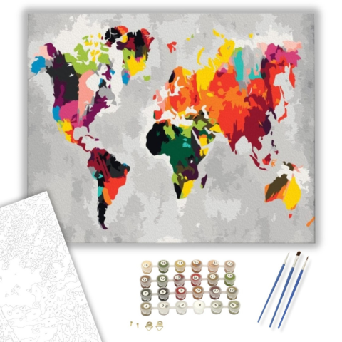 Szürke és Színes Világtérkép - számfestő készlet – 40×50 cm (Keretre feszítve) Készíts gyönyörű műalkotásokat, előzetes festő tudás nélkül! Éld át az alkotás gyönyörű pillanatait és varázslatos hangulatát! Akkor is gyönyörű festményeket hozhatsz létre, ha