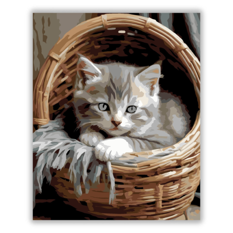 Szürke Kiscica Kosárban - számfestő készlet – 40×50 cm (Keret nélkül) A festmény egy szürke kiscicát ábrázol, amint egy fonott kosárban pihen. A finom színek, mint a szürke és bézs, nyugodt és otthonos hangulatot teremtenek. A kép a béke és a meghittség é