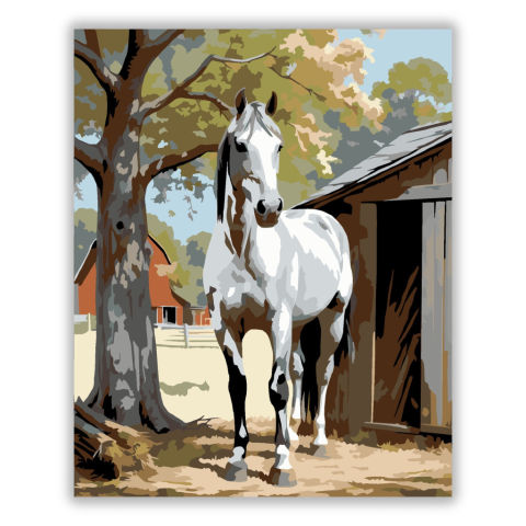Szürke Ló az Istállónál - számfestő készlet – 40×50 cm (Keret nélkül) A festmény egy szürke lovat ábrázol, amely egy nagy tölgyfa árnyékában, egy fa istálló mellett áll. A kép meleg barna és zöld árnyalatokkal festi meg a békés vidéki tájat. A jelenet nyu