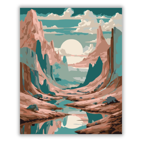 Szürreális Tükrözött Táj - számfestő készlet – 40×50 cm (Keret nélkül) A festmény szürreális tájat ábrázol, ahol a hegyek és az ég tükröződnek egy békés vízfelszínen. A türkiz, borostyán és poros rózsaszín színek harmonikus átmenetei nyugodt, ám misztikus