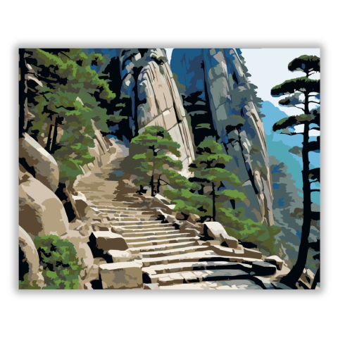 Taishan Lépcsőinek Monumentális Utazása - számfestő készlet – 40×50 cm (Keret nélkül) A festmény a Taishan hegy meredek lépcsősorának lenyűgöző látványát tárja elénk, ahol a kőlépcsők fenyők árnyékában kanyarognak. A gazdag zöldek és a sziklák természetes