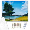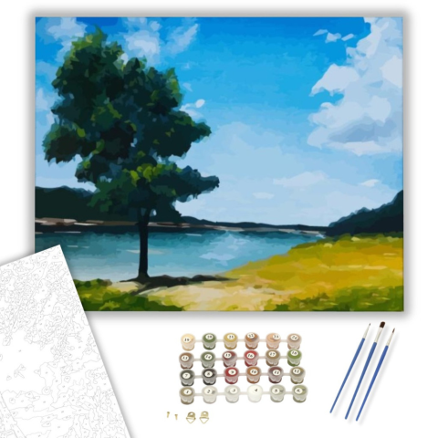 Táj - számfestő készlet – 40×50 cm (Keretre feszítve) Ez a festmény egy nyugodt, idilli tájat ábrázol, amely békét és harmóniát sugároz a néző számára. A kép egy magányos fa árnyékában mesél el egy csendes történetet a természet szépségéről. A kék ég és z