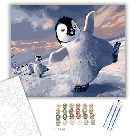 Táncoló pingvinek - számfestő készlet – 40×50 cm (Keretre feszítve) A kép egy vidám és játékos hangulatot áraszt, ahogy a pingvinek táncolnak a hóborította tájon. A jelenet életre kelti a téli mesevilágot, ahol minden lépés egy új kaland kezdete. A hűvös