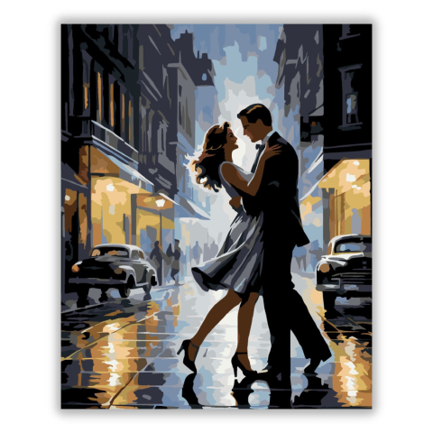 Táncoló Szerelmespár Esőben - számfestő készlet – 40×50 cm (Keret nélkül) A festmény egy szerelmespárt ábrázol, amint lassan táncolnak egy üres utcán éjszaka, az eső csillogó tükrében. A kép fekete-fehér színvilága erős kontrasztot teremt, kiemelve a roma
