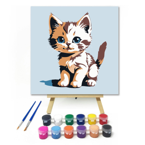 Tarka kiskandúr - gyerek számfestő készlet – 20×20 cm (Keretre feszítve) Ez a kép egy bájos, tarka kiskandúrt ábrázol, aki kíváncsian néz a világra a puha tappancsain. A meleg barna és krémszínű foltok életre keltik a vidám cicát. Tökéletes választás mind