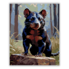 Tasmán Ördög Ébersége - számfestő készlet – 40×50 cm (Keret nélkül) A festmény egy éber tasmán ördögöt ábrázol, amint feszülten figyel környezetére egy erdei tisztáson. A kép sötét és világos kontrasztokat használ, kiemelve az állat fénylő szemeit és fény