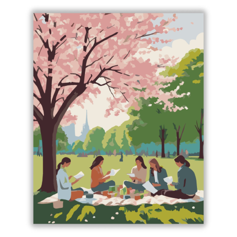 Tavaszi Búcsú Piknik a Parkban - számfestő készlet – 40×50 cm (Keret nélkül) A festmény osztálytársakat ábrázol, akik egy tavaszi pikniken ülnek pokrócon a parkban, jegyzeteket és ajándékokat cserélve. A virágzó fák és a zöldellő környezet friss és élénk