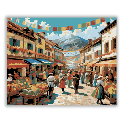 Tavaszi Fesztivál a Városi Térben - számfestő készlet – 40×50 cm (Keret nélkül) A festmény egy kisvárosi tér tavaszi fesztiválját ábrázolja, ahol az emberek virágpiacok között sétálnak, és zenészek vidám dallamokat játszanak. Az élénk színek, mint a kék,