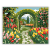 Tavaszi Rózsaív a Kertben - számfestő készlet – 40×50 cm (Keret nélkül) A festmény egy keskeny kerti ösvényt ábrázol, amelyet élénk tulipánok szegélyeznek, míg egy rózsákkal befutott fa boltív vezet a titkos tavaszi kertbe. Az élénk zöld, piros és sárga s