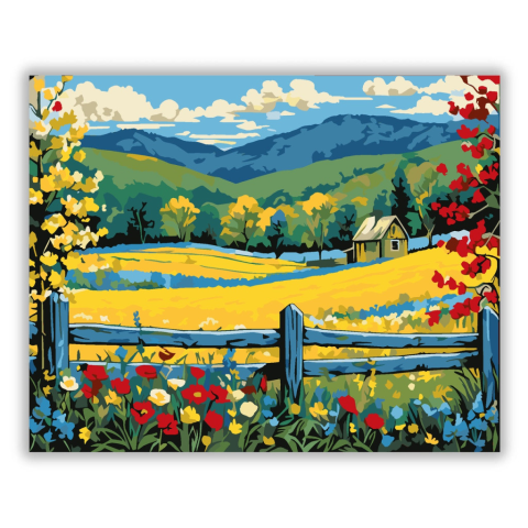Tavaszi Táj Harmóniája - számfestő készlet – 40×50 cm (Keret nélkül) A festmény egy idilli vidéki tájat ábrázol, ahol a természet szépsége és a nyugalom uralkodik. A gazdag színpaletta és a lendületes ecsetkezelés életet ad a tájnak, kiemelve a sárga mező