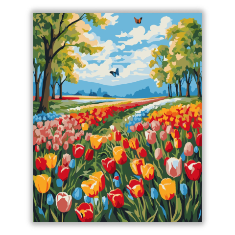 Tavaszi Tulipánmező - számfestő készlet – 40×50 cm (Keret nélkül) A festmény egy színes tulipánmezőt ábrázol, ahol pillangók repkednek a virágok felett a tiszta kék ég alatt. Az élénk piros, sárga és kék színek vidám, élettel teli hangulatot teremtenek. A
