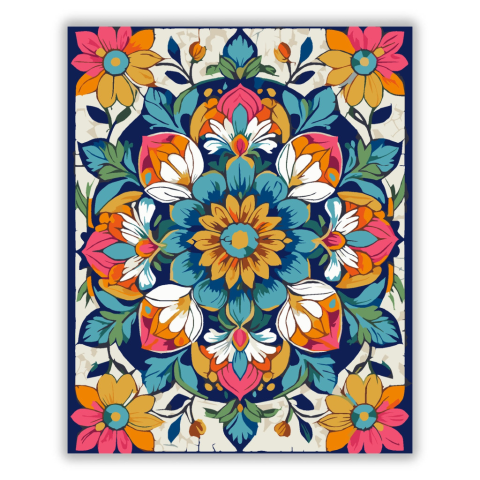 Tavaszi Virág Mandala - számfestő készlet – 40×50 cm (Keret nélkül) A festmény egy részletgazdag mandalát ábrázol, amelyben tavaszi virágok és bimbók bontakoznak ki. Az élénk kék, rózsaszín és sárga színek dinamikus és frissítő hangulatot teremtenek. A ké