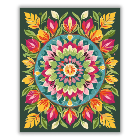 Tavaszi Virágos Mandala Élénk Színekkel - számfestő készlet – 40×50 cm (Keret nélkül) A festmény egy tavaszi ihletésű mandalát ábrázol, amely virágbimbókat és leveleket tartalmaz. A kompozíció élénk, merész színekben pompázik, mint a piros, sárga és zöld