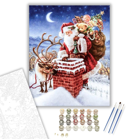 Télapó a háztetőn - számfestő készlet – 40×50 cm (Keretre feszítve) Készíts gyönyörű műalkotásokat, előzetes festő tudás nélkül! Éld át az alkotás gyönyörű pillanatait és varázslatos hangulatát! Akkor is gyönyörű festményeket hozhatsz létre, ha még nem fe