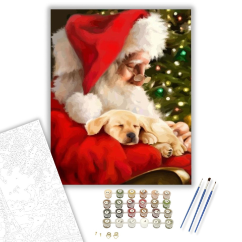 Télapó kiskutyával - számfestő készlet – 40×50 cm (Keretre feszítve) Készíts gyönyörű műalkotásokat, előzetes festő tudás nélkül! Éld át az alkotás gyönyörű pillanatait és varázslatos hangulatát! Akkor is gyönyörű festményeket hozhatsz létre, ha még nem f