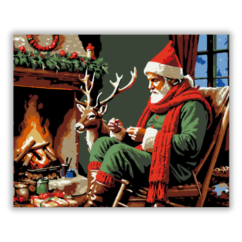 Télapó Meghitt Pillanata - számfestő készlet – 40×50 cm (Keret nélkül) A kép közepén Télapó békésen ül, kezében fonalat tartva, míg mellette hű társa, a szarvas, csendesen figyel. A háttérben a kandalló lángjai aranyló fényben füröszti a szoba melegét, me