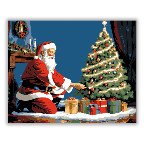 Télapó Ünnepi Pillanata - számfestő készlet – 40×50 cm (Keret nélkül) A képen egy álomszerű jelenet tárul elénk, ahol a Télapó éppen ajándékokat helyez el egy ragyogó karácsonyfa alatt, pillekönnyű hóval borított szobában. A háttéren a kandalló meleg fény