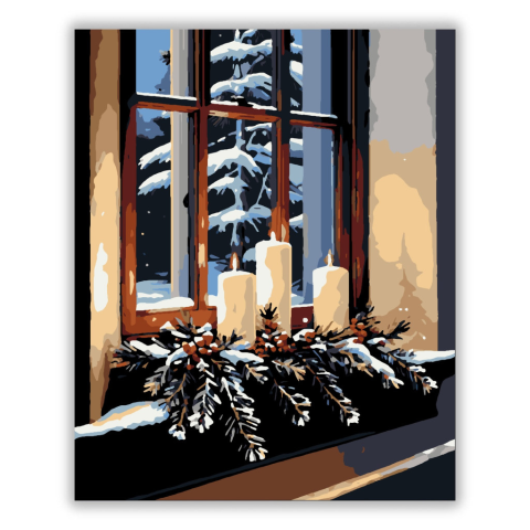 Téli Ablakvarázs - számfestő készlet – 40×50 cm (Keret nélkül) A kép közepén három gyertya áll, melyek fénye finoman világítja meg az ablakpárkányt, ahol hóval borított fenyőágak és piros bogyók díszlenek. A sötétkék, csillagokkal pettyezett éjszakai hátt