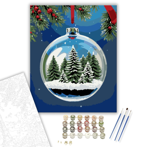 Téli Csillámló Erdő - számfestő készlet – 40×50 cm (Keretre feszítve) Ebben a varázslatos üveggömbben meseszép fenyők rejtőznek, akik hófehér díszruhájukban pompáznak. A háttér mélykék éjszakai égboltja ünnepi hangulatot áraszt, miközben a gyengéd hópelyh