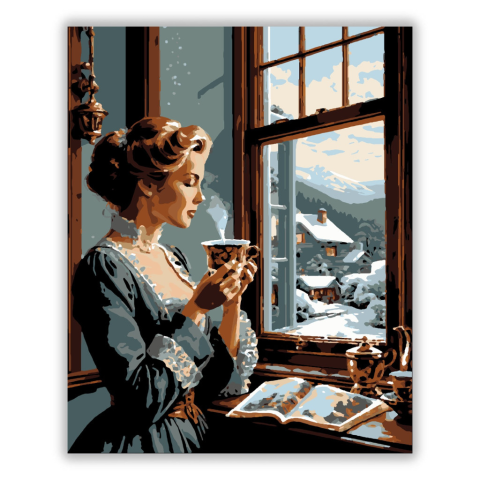 Téli Elmélkedés - számfestő készlet – 40×50 cm (Keret nélkül) Az ablak mellett álló, elegáns ruhába öltözött nő kezében forró teát tart, miközben bepillant a hóborította, hegyekkel ölelt téli tájba. A meleg, aranyló fények és az éggel játszó halvány kékes