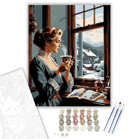 Téli Elmélkedés - számfestő készlet – 40×50 cm (Keretre feszítve) Az ablak mellett álló, elegáns ruhába öltözött nő kezében forró teát tart, miközben bepillant a hóborította, hegyekkel ölelt téli tájba. A meleg, aranyló fények és az éggel játszó halvány k