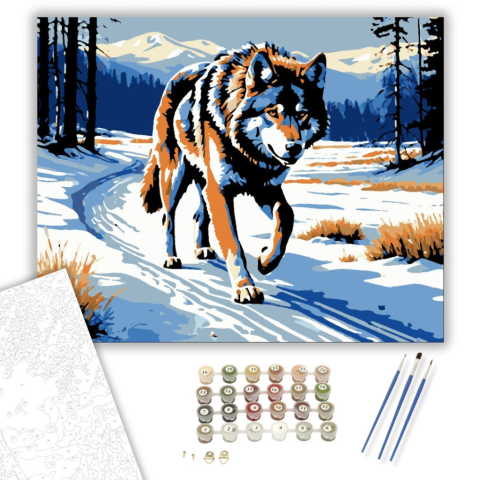 Téli Farkas Kóborlás - számfestő készlet – 40×50 cm (Keretre feszítve) Egy magányos farkas lépked a hóval borított tájon, tekintete a távolba mered, fenséges és vad megjelenése megragadja a látványt. A háttérben húzódó hósapkás hegyek és vékonyan induló f