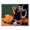 Téli Fűszeres Áhítat - számfestő készlet – 40×50 cm (Keret nélkül) A kép középpontjában egy üvegpohárban gőzölgő forralt bor látható, tele narancsszeletekkel és fahéjrúddal, mellette csillagánizs és friss narancsszeletek díszelegnek. A háttér mély, meleg