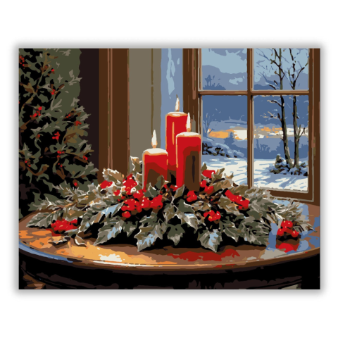 Téli Gyertyafény Harmónia - számfestő készlet – 40×50 cm (Keret nélkül) Az asztalon három gyertya áll, körülötte magyallevelek és élénk piros bogyók ölelik körbe, mint egy ünnepi koszorú. A háttérben a hóval borított táj varázslatos kékje és az alkonyat n