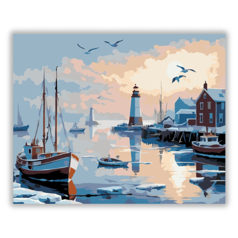 Téli Halászkikötő Világítótoronnyal - számfestő készlet – 40×50 cm (Keret nélkül) A festmény egy csendes téli halászkikötőt ábrázol, ahol a hajók ringatóznak a jeges vízen, és sirályok ülnek a havas köteleken. A színek hideg kék és szürke árnyalatok, amel