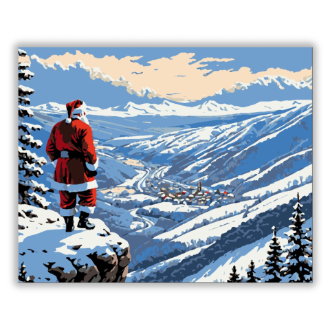 Téli Hegyeink Meghittsége - számfestő készlet – 40×50 cm (Keret nélkül) A képen egy magányos télapó áll a hófödte hegycsúcs peremén, tekintete a kis falura szegeződik, amelyet a völgy lágy vonalai ölelnek körbe. A háttér derengő naplemente színei kékes hó