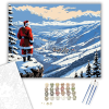 Téli Hegyeink Meghittsége - számfestő készlet – 40×50 cm (Keretre feszítve) A képen egy magányos télapó áll a hófödte hegycsúcs peremén, tekintete a kis falura szegeződik, amelyet a völgy lágy vonalai ölelnek körbe. A háttér derengő naplemente színei kéke