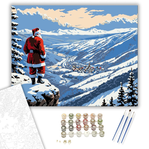 Téli Hegyeink Meghittsége - számfestő készlet – 40×50 cm (Keretre feszítve) A képen egy magányos télapó áll a hófödte hegycsúcs peremén, tekintete a kis falura szegeződik, amelyet a völgy lágy vonalai ölelnek körbe. A háttér derengő naplemente színei kéke