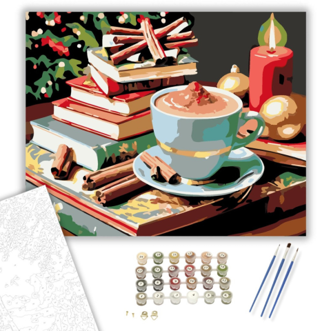 Téli Melegség - számfestő készlet – 40×50 cm (Keretre feszítve) Egy gőzölgő, fahéjjal megszórt forró csokoládé csésze pihen ünnepi könyvek társaságában, melyek mesés történeteket ígérnek. A háttér csillogó gyertyalángja és arany gömbdíszek teremtik meg a