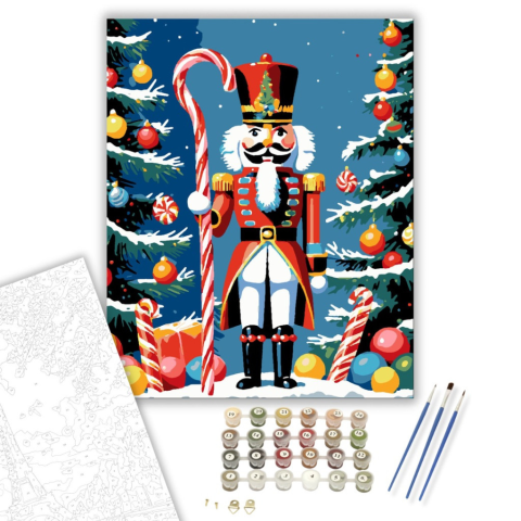 Téli Mesék Diótörője - számfestő készlet – 40×50 cm (Keretre feszítve) A kép közepén egy pompásan öltözött, elegáns diótörő áll, magabiztosan tartva mézédes cukorrúdját, miközben körülötte ünnepi fenyőfák szikráznak. Az élénk piros, zöld és kék árnyalatok