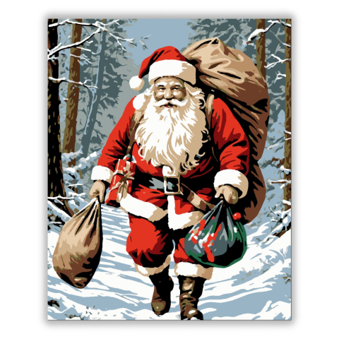 Téli Mesélő Ajándékhordozó - számfestő készlet – 40×50 cm (Keret nélkül) A kép középpontjában egy mosolygó télapó áll, aki hatalmas zsákját és különféle ajándékokat cipel egy hófödte erdő ösvényén. A színek gazdag palettája életre kelti a téli tájat, ahol