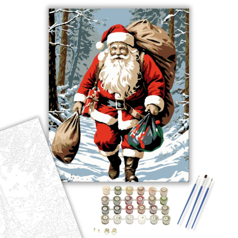 Téli Mesélő Ajándékhordozó - számfestő készlet – 40×50 cm (Keretre feszítve) A kép középpontjában egy mosolygó télapó áll, aki hatalmas zsákját és különféle ajándékokat cipel egy hófödte erdő ösvényén. A színek gazdag palettája életre kelti a téli tájat,