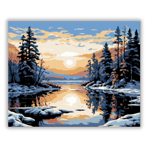Téli Naplemente - számfestő készlet – 40×50 cm (Keret nélkül) A kép közepén egy fagyos tó tükrözi vissza a lenyugvó nap aranyló fényét, míg a part menti fenyőfák a természet idilli csendjét őrzik. Az ég és a víz színkavalkádja, az arany és a kék harmóniáj