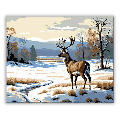 Téli Nyugalom Szarvasa - számfestő készlet – 40×50 cm (Keret nélkül) A képen egy fenséges szarvas áll kiemelkedően, ahogy békésen szemléli a havas, téli tájat. A háttérben a kék égbolt és a halvány narancsszínű naplemente fényei visszatükröződnek a hóval