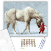 Téli séta - számfestő készlet – 40×50 cm (Keretre feszítve) A festmény egy meghitt, téli pillanatot örökít meg, ahol a hóesés békés csendje öleli körül a tájat. Egy gyermeki kíváncsiság találkozik az állatok iránti szeretettel, ahogy egy kisgyermek és egy