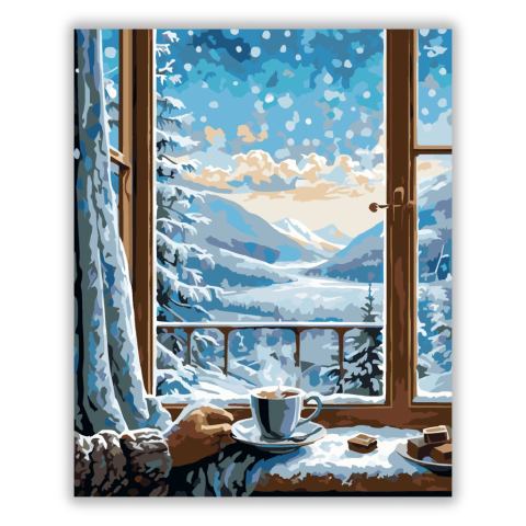Téli Táj Ablakon Át - számfestő készlet – 40×50 cm (Keret nélkül) A festmény egy ablakpárkányt ábrázol, ahol egy kéz forró csésze kakaót tart, a háttérben pedig havas hegyek és fenyők láthatók. A kép hideg kék és fehér árnyalatokkal, valamint meleg naranc
