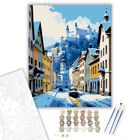 Téli Városi Harmónia - számfestő készlet – 40×50 cm (Keretre feszítve) A festmény egy bájos téli város utcáját ábrázolja, ahol a színes házak sorakoznak lenyűgöző, hósapkás tetőikkel. A háttérben egy fenséges, hófödte kastély magasodik, amely mesebeli han