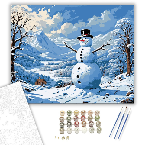 Téli Vidámság - számfestő készlet – 40×50 cm (Keretre feszítve) A képen egy vidám hóember áll a hósipkás hegyek ölelésében, cilinderével mosolyt csalva mindenki arcára. A háttérben a kék és fehér kontrasztjai sejtelmesen kergetőznek az égbolton, miközben